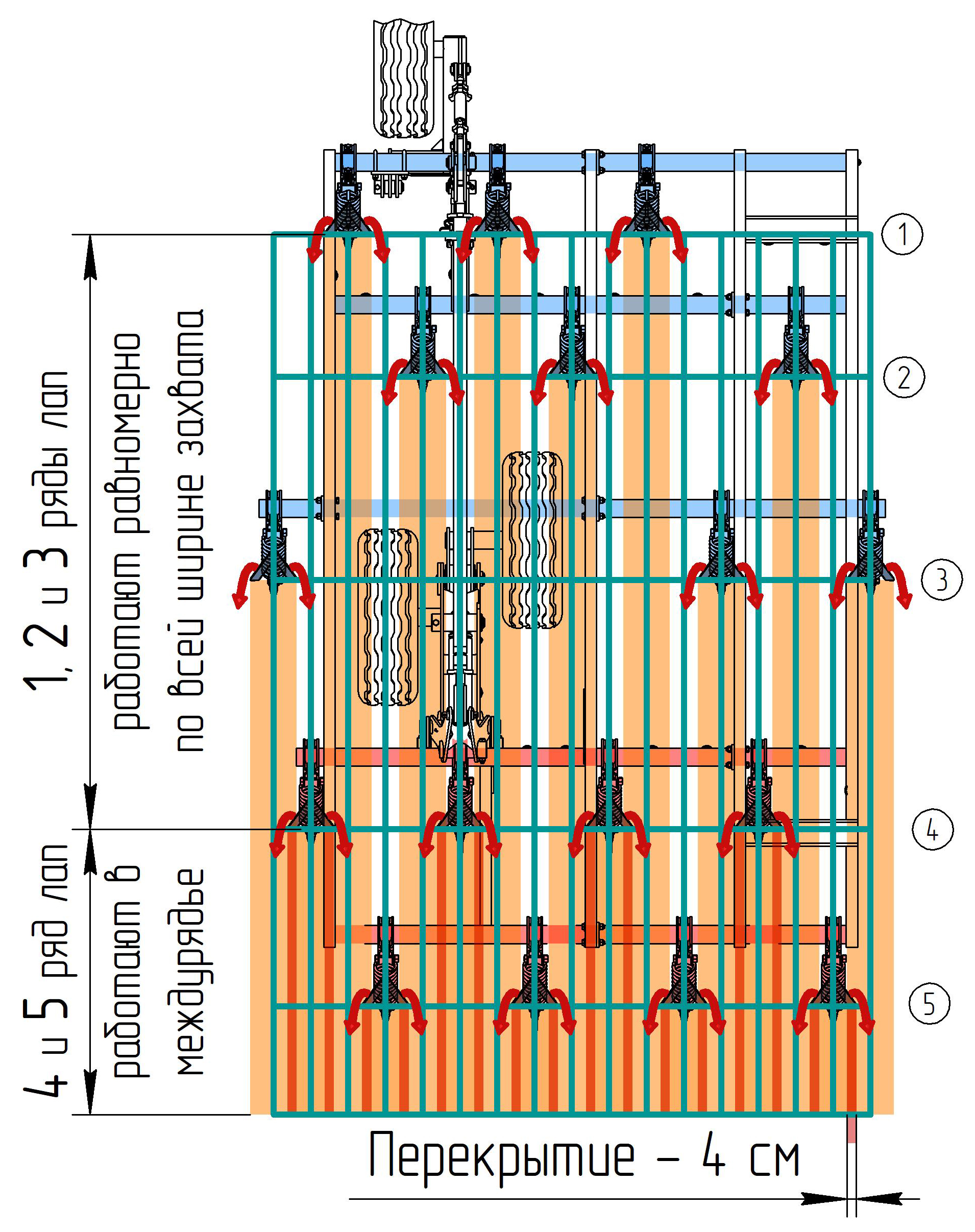 2. Выравнивание. Планомерное распределение лап по всей ширине захвата. Равномерное распределение почвы и растительных остатков.
