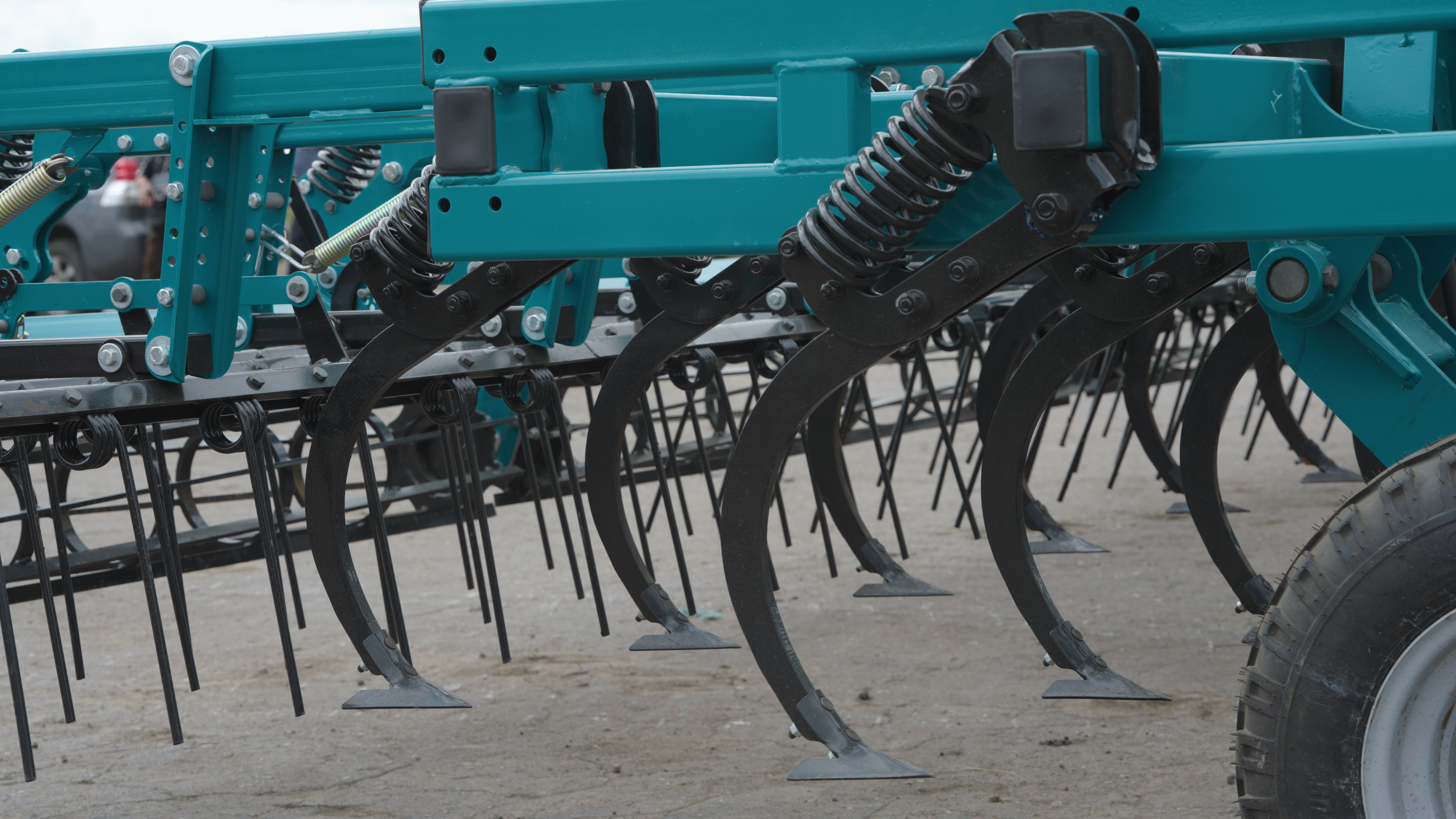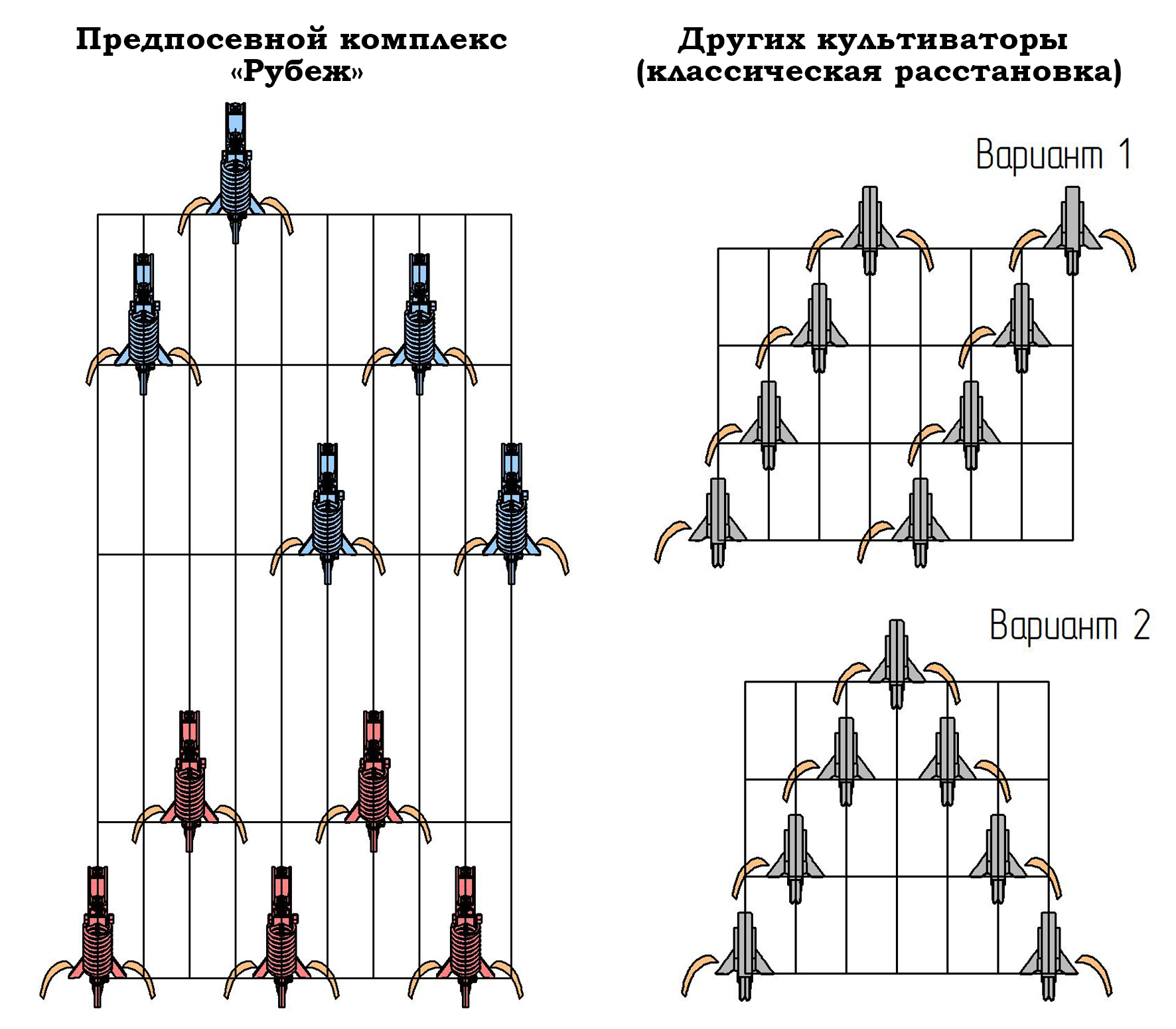 Комплекс предпосевной обработки «РУБЕЖ» выполняет сплошную обработку почвы (культивацию) на глубину до 12 см. Стрельчатые лапы шириной 200 мм создают при работе мелко комковатую структуру. Расстановка лап с перекрытием в 30 мм обеспечивает 100% подрезание сорных растений и образует ровный посевной стол. S-образная стойка 70 х 12 мм выполнена подпружиненной и обеспечивает защиту конструкции рамы при наезде на препятствие, вибрация подпружиненной стойки улучшает вычесывание сорняков и крошение почвы. Многорядное расположение стоек (5 рядов) обеспечивает свободное прохождение растительных остатков, которые не скапливаются между стойками.
